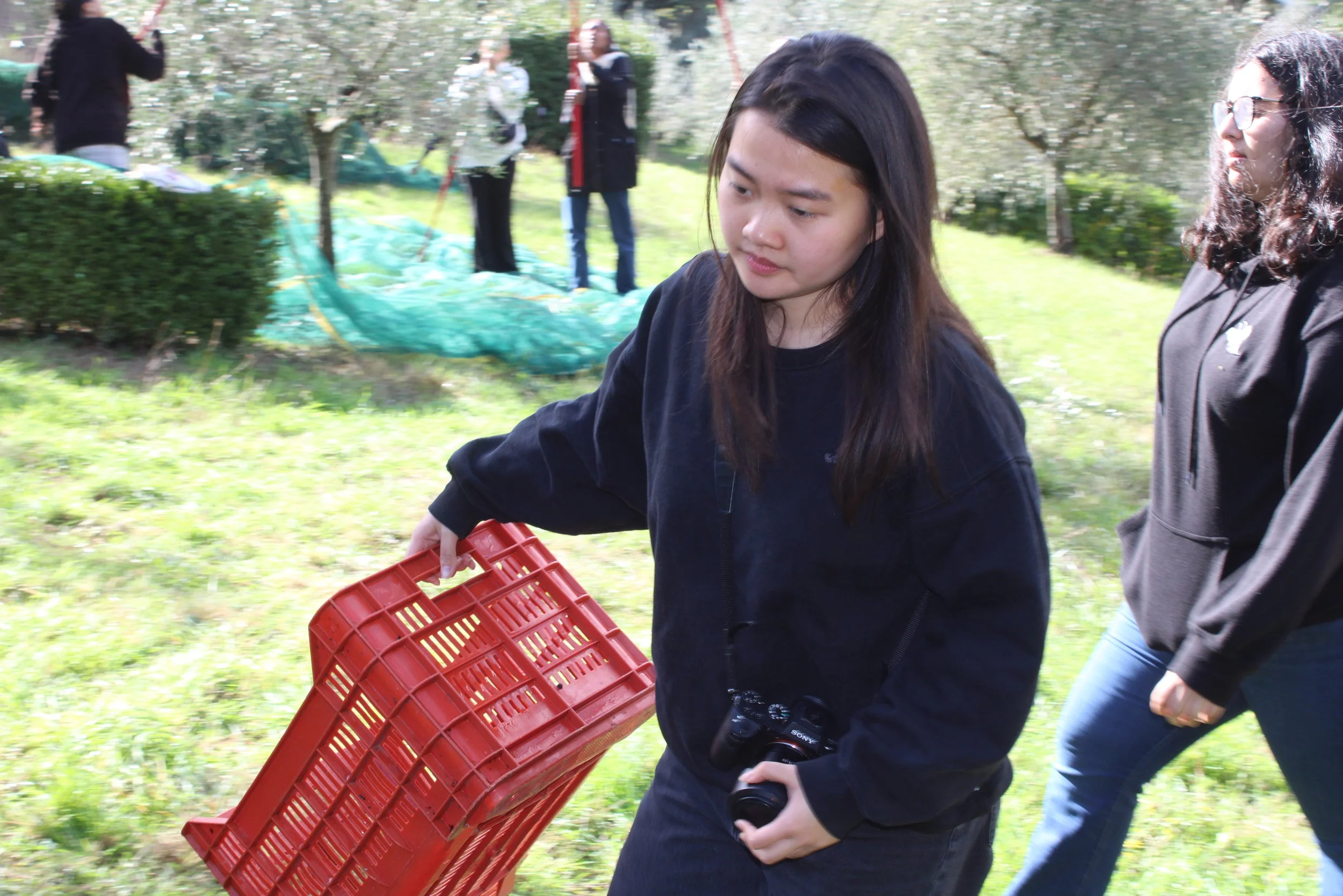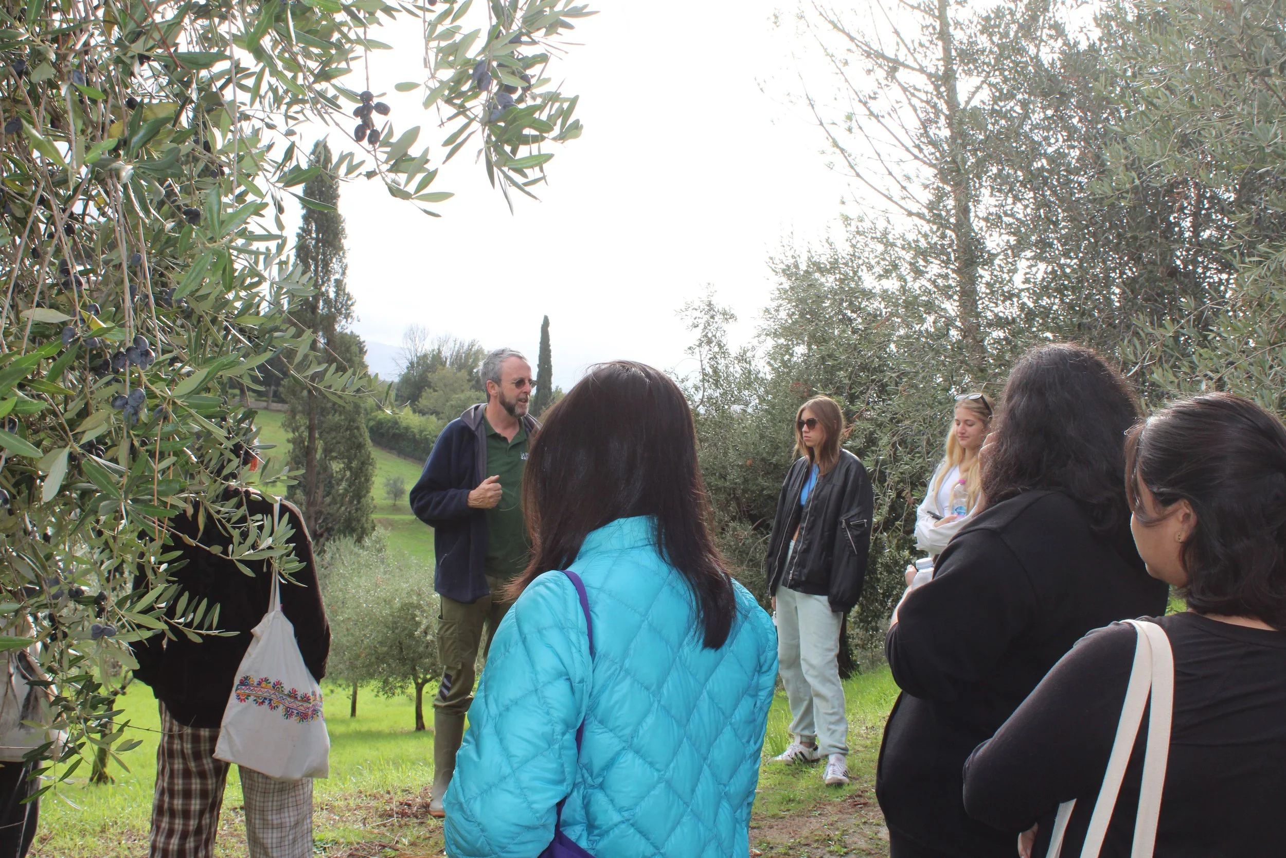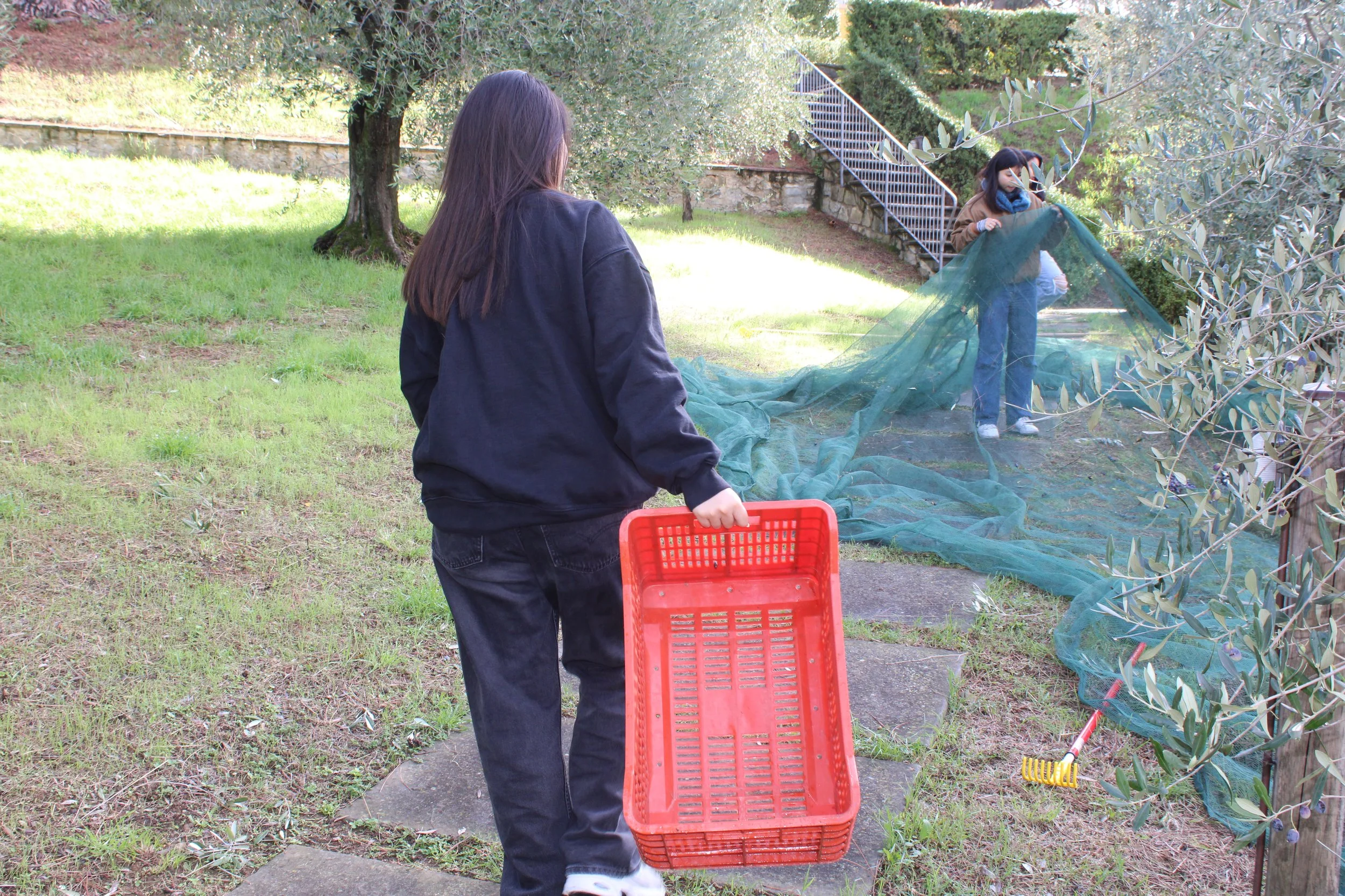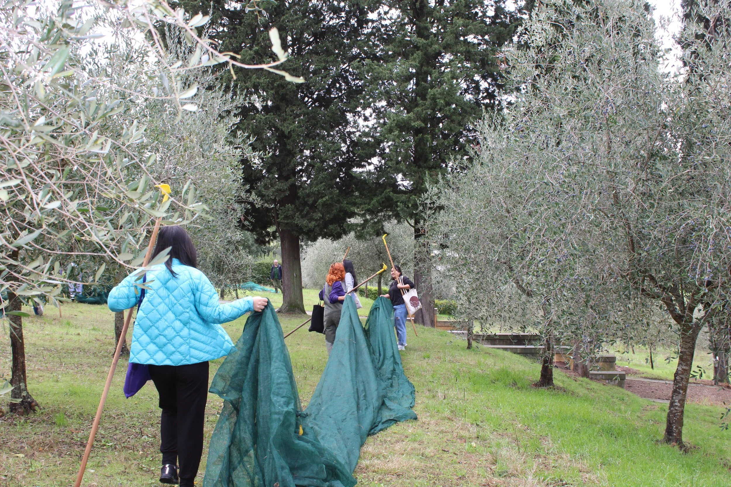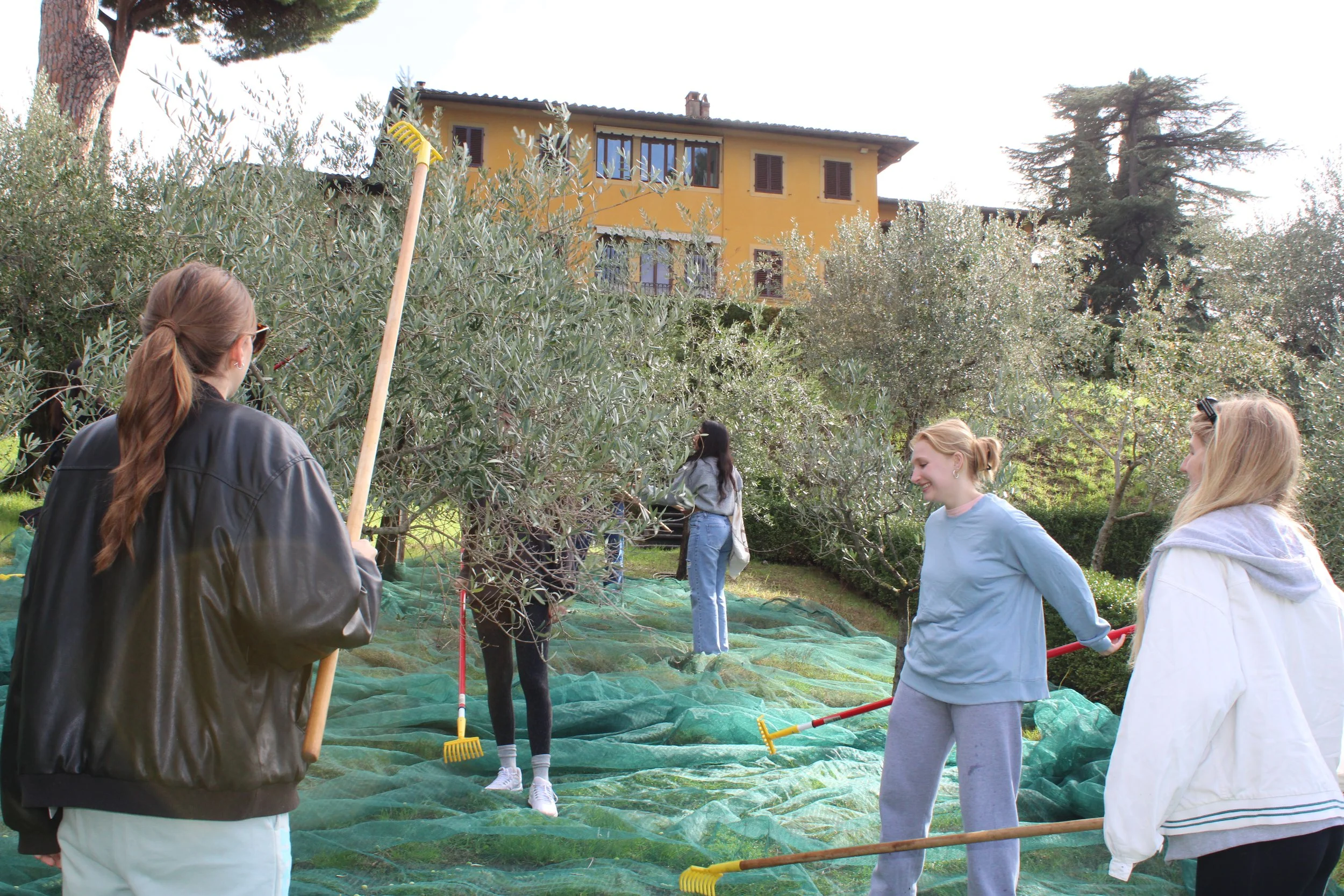 Each year, as part of a unique class experience, NYU Florence students actively participate in the harvesting of olives on campus grounds, turning theory into practice through hands-on engagement. Guided by faculty and local experts, students learn the intricacies of olive cultivation, harvesting techniques, and the traditional methods of pressing olives into oil. This immersive activity not only deepens their understanding of sustainable agriculture and food production but also connects them to the Tuscan landscape and its cultural heritage. The process culminates in the production of NYU’s very own olive oil, a product shaped by student collaboration, curiosity, and care.